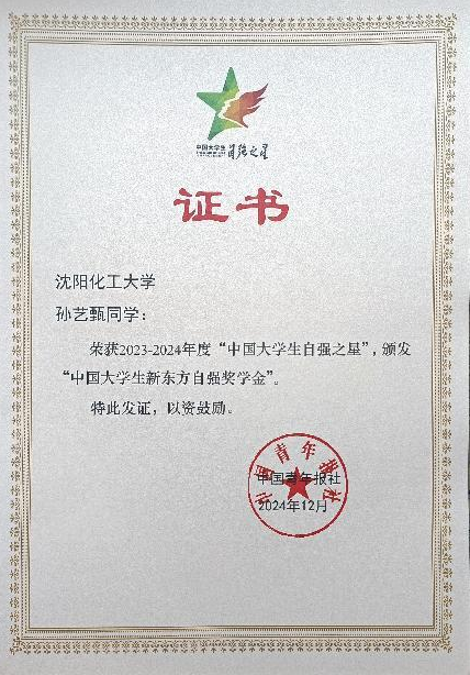 近日,从共青团中央、全国学联传来喜讯,由团中央基层建设部、中国青年报社、新东方教育科技集团、中国青年创业就业基金会联合举办的2023 - 2024年度“中国大学生自强之星”奖学金评选结果揭晓,beat·365孙艺甄同学凭借出色的个人表现和突出的自强事迹,荣获“中国大学生自强之星”荣誉称号。